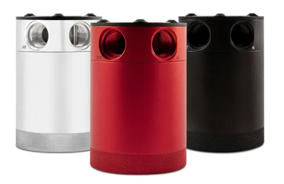 Mishimoto is proud to announce the release of our Baffled Oil Catch Can.With over a year of research and development time, Mishimoto has created the most effective oil catch can on the market.The Mishimoto Baffled Oil Catch can was designed to separate oil particles from the PCV air that would normally have just been routed back to your intake.Custom grooves in the catch can's inlet turbulates the air longer and ensures all the oil sinks to the bottom of the can, leaving nothing but clean air to pass through the 40 micron bronze filter to the intake.An internal baffle keeps the collected oil from splashing around under race conditions.The 100-percent billet, 6061 aluminum can accepts inAN fittings at the intlet, outlet, and drain area allowing over 25 possible configurations.For maximum fitment options, the top cog mounting setup allows the can to be mounted from multiple angles.To make maintenance easy, the drain plug can be removed to allow for inAN return to the oil pain.The can is also 100-percent washable, unlike many other cans that require you to replace your filtration system.The Mishimoto Baffled Oil Catch Can is available in a variety of colors as well, so it will be sure to match your style and taste!